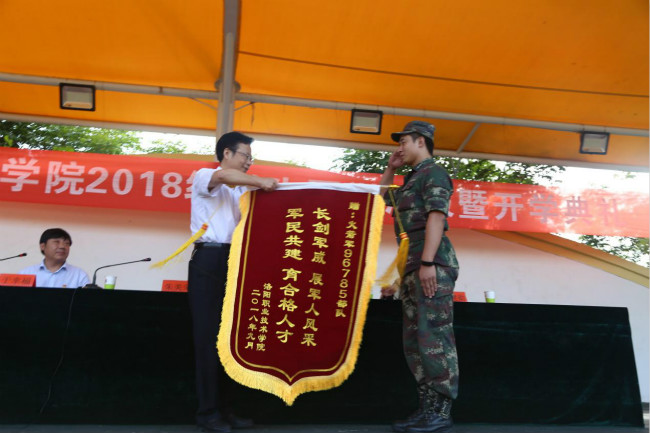 副院长孙建勋宣读感谢信,朱美荣书记代表学校向承训部队赠送锦旗。
