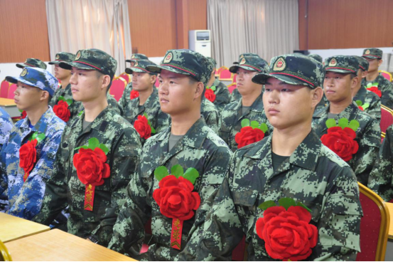 会后,学院武装部工作人员为52名即将应征入伍的大学生颁发了纪念品;副院长韦元民与佩戴大红花的全体应征入伍大学生合影留念。