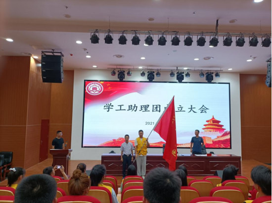 李少沛向学工助理团授旗;学工助理代表韩昊龙代表学工助理团上台领旗。