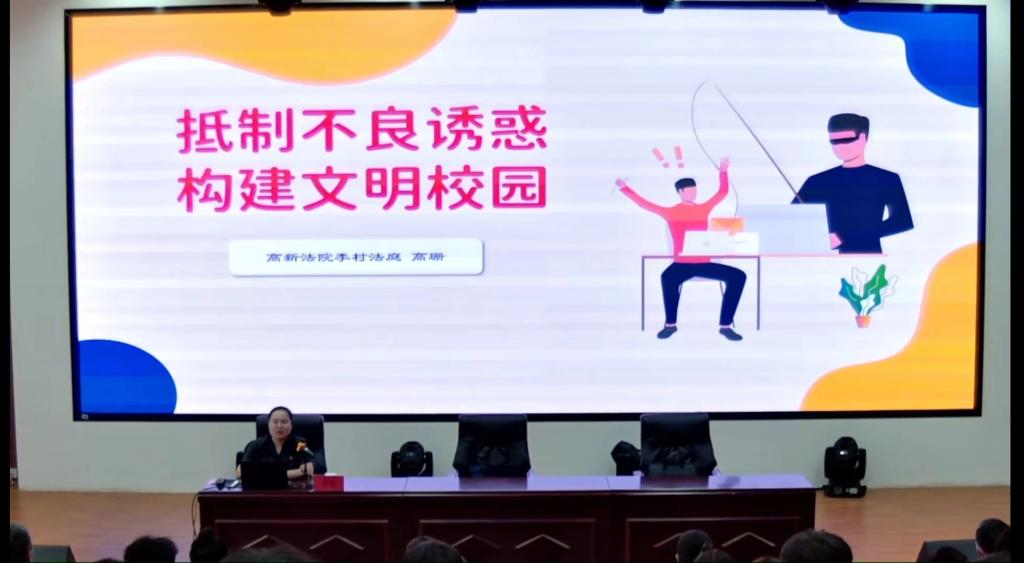 本次讲座邀请了伊滨区公安分局郭明杰警官和高新区法院高珊法官。郭明杰警官围绕电信诈骗概念、常见形式和识别防范方法等方面进行讲解,加深了同学们对电信诈骗的认识,帮助同学们掌握了防范电信诈骗方法。高珊法官以《抵制不良诱惑,构建文明校园》为主题,用一个个生动具体的案例,科普法律法规,引导同学们遵守校规校纪,抵制不良诱惑,远离校园欺凌,系好人生安全的“纽扣”。