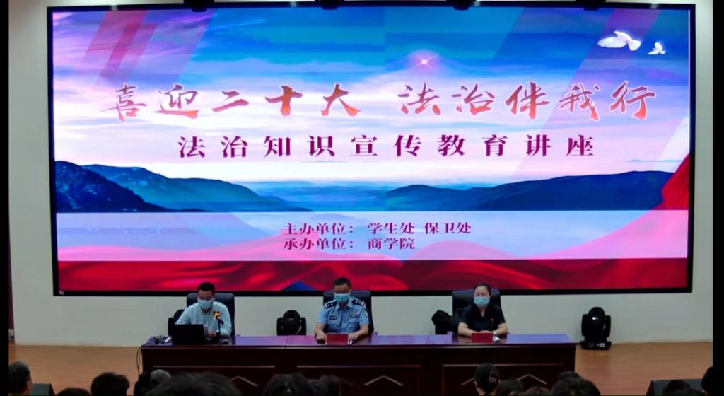 为进一步推进校园法治宣传教育,提升学生法治意识和法律素养,落实三全育人成效,我校在大学生活动中心二楼心理剧场举办“喜迎二十大,法治伴我行”专题法治知识宣传教育讲座,线下线上同步进行,全体在校生参与,讲座由学生处副处长周吉霖主持。