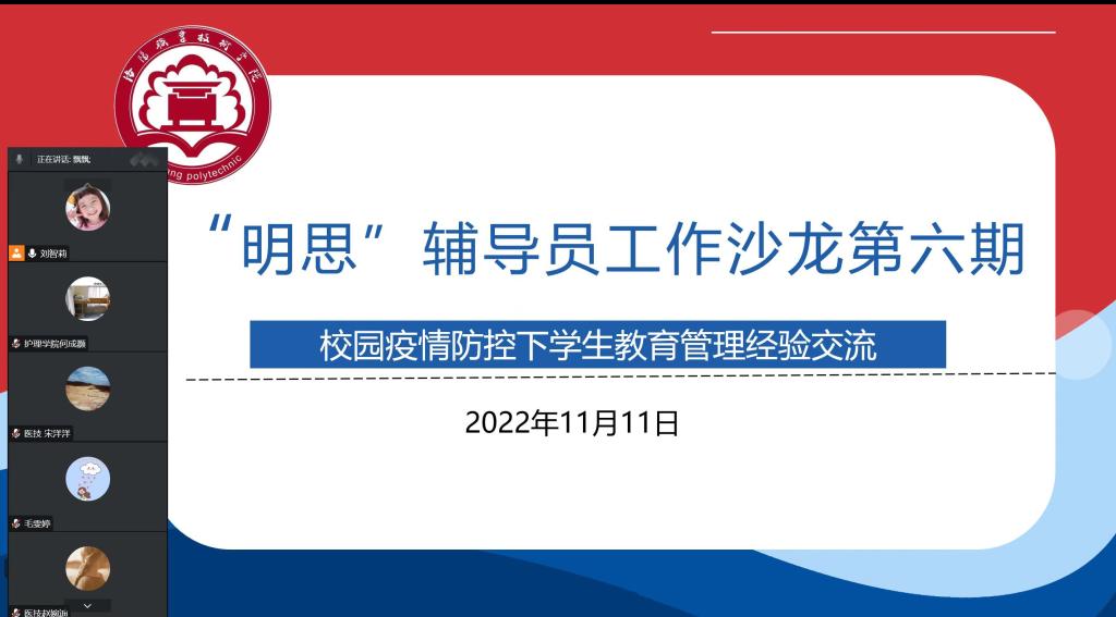 11月11日上午,第六期“明思”辅导员工作沙龙在腾讯会议举行,本期主题为“校园疫情防控下学生教育管理经验交流”。思政科科长温慧芳,部分辅导员参加了本次活动,由会计学院刘智莉主持。