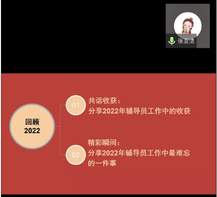 沙龙活动以刘茜、刘哲、张亚洁、夏丽红、魏笑、肖楠、杨杰、毛雯婷八名辅导员通过讲述工作中的难忘瞬间和成长感悟,向大家分享了2022年工作中的收获。在才艺表演环节,辅导员王若楠带来的舞蹈《超级冠军》、王浩璇演唱歌曲《陷阱》、王怡萱的长笛演奏《always with me》,将本次沙龙活动推向了高潮。随后,赵晓乐、张冰玉、吴昊、何思源四位学工办主任围绕沙龙举办内容与形式、学生工作品牌建设、辅导员成长与发展等方面谈了意见建议,与各位辅导员共同谋划2023年的工作。