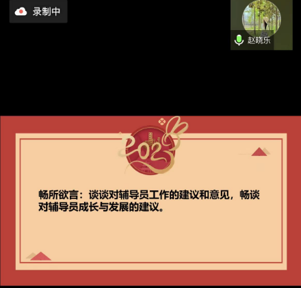 12月30日下午,我校第七期“明思”辅导员工作沙龙在腾讯会议举行,学生处处长李少沛、思政科科长温慧芳,以及部分辅导员参加本次活动。本期沙龙的主题为“沙龙齐欢聚,一起来跨年”,由信息技术与城建学院辅导员张亚沛和医学院辅导员翟一帆主持。