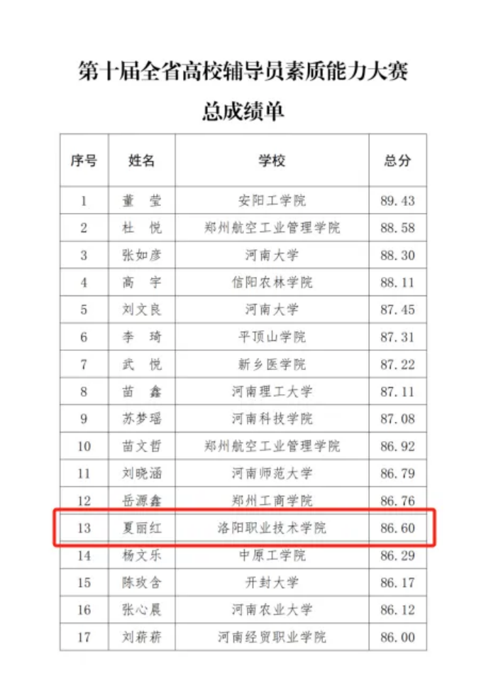 4月24日,河南省教育厅公布了第十届河南省高校辅导员素质能力大赛结果,我校信息工程学院学工办主任夏丽红荣获一等奖,位列高职高专学校第一名。