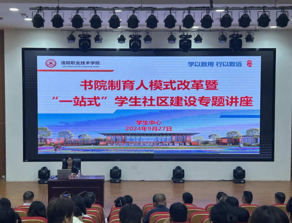 为进一步推动我校“一站式”学生社区高质量建设,9月27日下午,学校特邀郑州西亚斯学院党委学工部部长白萌莅临我校作题为《活化空间、数智赋能--“1+N+云”社区育人新生态》专题讲座。会议在大学生活动中心二楼心理剧场举行,学生中心副主任李少沛主持会议。各学院(书院)、相关职能部门负责人,各学院(书院)副书记、学工办主任、团总支书记、全体专职辅导员参会。