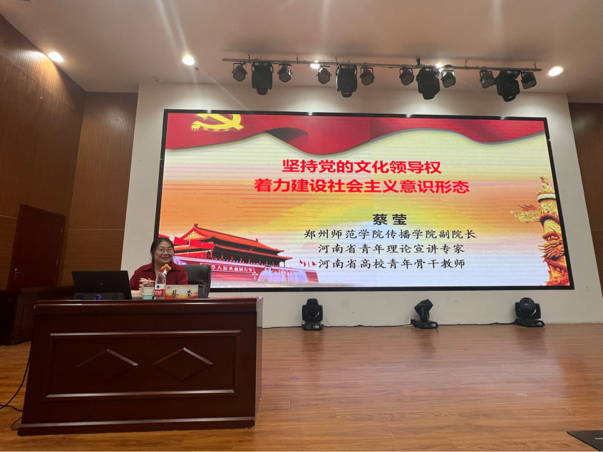 郑州师范学院传播学院副院长蔡莹博士以《坚持党的文化领导权 着力建设社会主义意识形态》为题,从意识形态工作“为国家立心、为民族立魂”的重要意义,到应对国际斗争、网络变革等风险的方法,再到结合经典案例和热点话题的生动解读,深入浅出地剖析了社会主义意识形态建设的核心要点,既有理论高度,又有实用的实践路径与操作指南,为我们带来了系统、深刻且实用的工作指导。