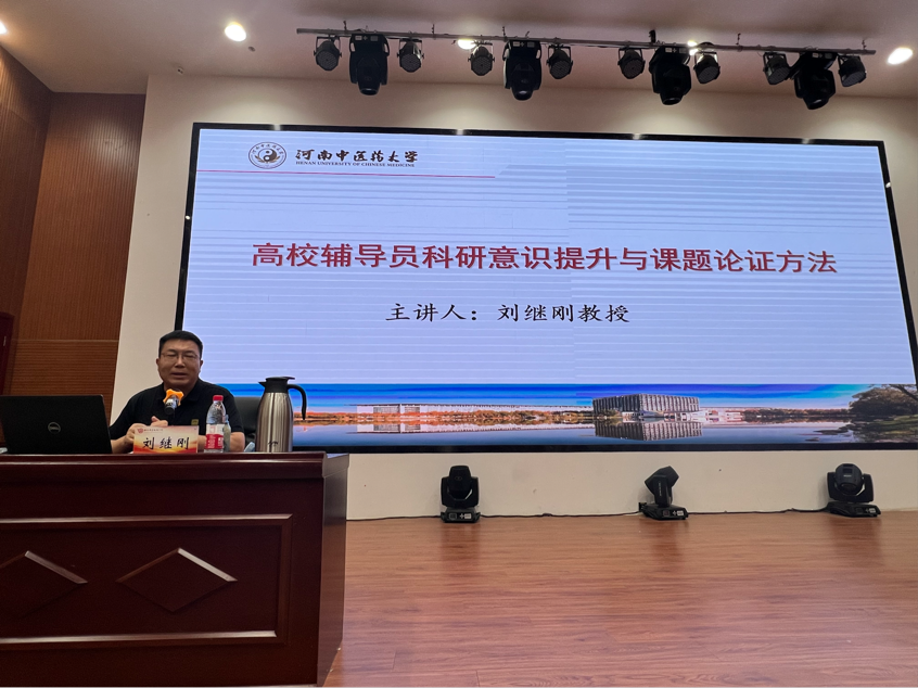 河南中医药大学管理学院院长刘继刚教授以《高校辅导员科研意识提升与课题论证方法》为题,深入阐释辅导员科研的重要意义,系统梳理课题主要类型,明确论证原则与方法,并结合“兴文化工程”案例进行生动解析,为辅导员提升科研素养、推动工作创新提供了有力指导。